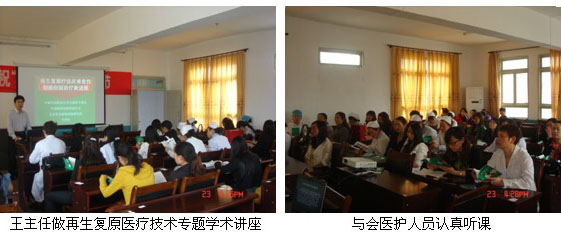 在学术讲座中,王主任首先向与会医护人员介绍了我国著名生命科学家、医学家徐荣祥教授在人体再生复原科学领域取得的实验及临床研究最新进展,在2010年年底公布的“人体生命延续之谜(二)——线粒体主导日常生命”,破解了“精、气、神、力”旺盛与人体启动了再生生命程序有关,与细胞内各主要细胞器功能的发挥有关,并进一步证实了一个生命体可以同时具有“基本生命”和“再生生命”等,然后结合了大量的临床病例图片,主要针对不同深度的烧伤创面及各类难愈性创伤、溃疡创面的规范化处理方法与技巧、注意事项及其各种原因引起的骨外露的治疗方案等进行了细致地讲解,并用向学员展示了骨科创疡创面清创、骨髓开窗术、糖尿病足合并坏死性筋膜炎早期清创术、微粒皮种植术等创面规范处理示范录像资料,并且详细解答了医护人员提出的各种提问。学术讲座一直持续到当日下午19:00时才结束。讲座中与会人员认真听讲,学习气氛浓厚,达到了进一步推广原位再生复原医疗技术临床应用的目的。
