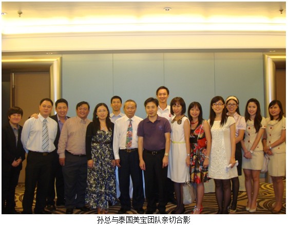 9月11日上午,孙总带着徐荣祥教授的问候应邀来到美宝泰国分公司,亲切会见泰国代理商刘志健先生。刘志健先生对于美宝此次高调参加第八届亚太烧伤会议表示无比欢迎,他激动地说:“现在的中国再也不是原来的中国了,今天的美宝再也不是15年前的美宝了!,泰国美宝这几年来发展迅速,相信在不久的将来一定会有更突出的业绩!”,并表示将一如既往地全力配合美宝在泰国的所有活动计划。