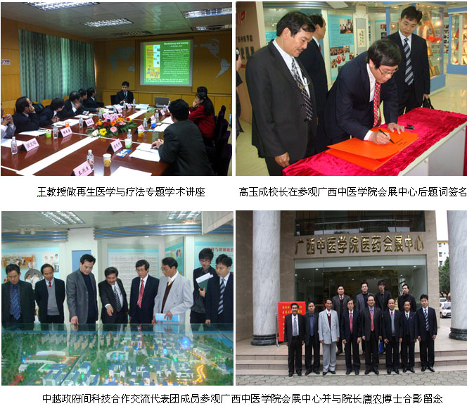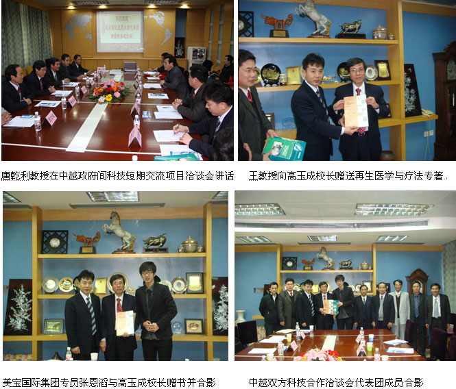 为尽快启动中越政府间科技交流合作项目,“中越政府间科技合作联委会第八次会议短期交流项目暨中越烧伤传统诊疗技术的交流与合作”洽谈会于2011年3月22日下午3时在在广西中医学院会展中心7楼第三会议室举行,出席洽谈会的中越双方代表分别是以广西中医学院院长唐农博士,科技处处长、项目负责人唐乾利教授,国际交流与合作处处长蒋基昌副教授、广西中医学院教务处长辛宁教授、广西中医学院科技处藤建北博士等领导和项目组其他成员组成的中方代表团及以越南顺化医药大学校长兼附属医院院长高玉成教授,顺化医药大学书记兼副校长陈友当教授,顺化医药大学附属医院副院长、副书记阮生松博士,顺化医药大学工会主席兼药理部副主任陈文和博士,顺化医药大学传统医学部副主任团文翰教授,顺化医药大学微生物部副主任陈停平教授一行6人组成的越方代表团,作为知识产权单位的代表,中国中西医结合烧伤专业委员会常委、中国烧伤创疡杂志副总编辑、北京美宝烧伤创疡研究所副所长、临床研究部主任王洪生教授、美宝国际集团技术推广专员张恩滔应邀出席了洽谈会。