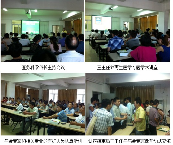 2012年8月30日应南安市医院的邀请,中国中西医结合学会烧伤专业委员会常委兼秘书、《中国烧伤创疡杂志》副总编辑、北京美宝烧伤创疡研究所副所长,临床研究部主任王洪生研究员到医院做“再生复原疗法在难愈性创面治疗新进展”专题学术讲座。该医院信息科主任医师梁科长主持了会议,王主任结合了大量的临床病例图片及录像资料,主要针对深度烧伤及各类难愈性创伤、溃疡创面、糖尿病足、放射性溃疡的规范化处理方法与技巧、注意事项等进行了细致地讲解,强调创面处理要大胆清创、减压、去除坏死组织,并保持创面生理的湿润环境,实现创面的再生复原,并建议对病人深达真皮层以下愈合后创面应进行防疤处理治疗。
