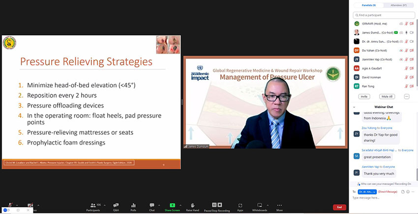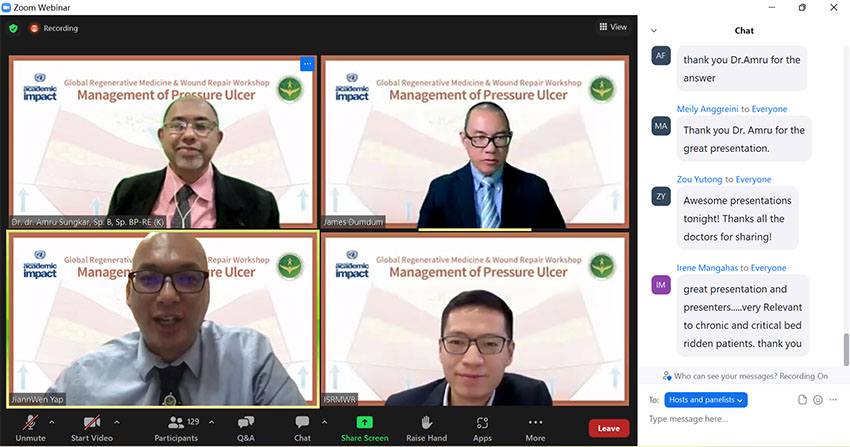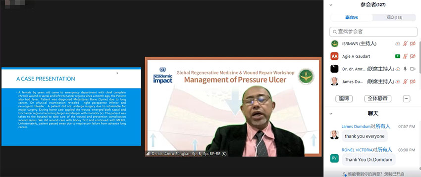 2022年11月16日,由国际再生医学与创面修复学会(ISRMWR)主办的“联合国学术影响力国际再生医学线上培训——压疮管理”成功举行。来自全球近300名医务工作者注册参加了此次培训,参会人员不仅有来自沙特、阿联酋、马来西亚、印尼、菲律宾等应用再生医疗技术较成熟的国家,还有美国、英国、新加坡等国慕名而来的参会者。