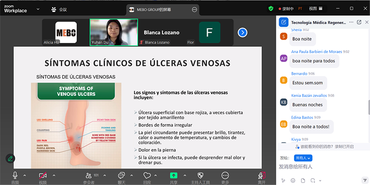 在专题研讨环节,美宝国际技术部讲师杜钰涵进行了深度学术分享,从流行病学特征、病理生理机制、国际诊断标准到再生医疗技术的作用机理与临床适应症,全方位构建了静脉溃疡的防治知识体系。特别针对联合治疗方案优化、典型病例分析及长期预防策略等临床痛点,提供了基于循证医学的解决方案。参会人员有来自巴西、秘鲁、哥斯达黎加等不同拉美国家的医生和学者们多达130人,大家在会议期间踊跃提问,诸如在应用再生医疗技术期间对于伤口恢复的作用、慢性创面的病因与再生医疗技术的作用机制,慢性创面多病因分析与个体化治疗策略等,提出的问题得到逐一解答,获得与会者一致好评。现场互动热烈,充分展现了再生医疗技术在慢性创面治疗领域的突破性价值与国际认可度。