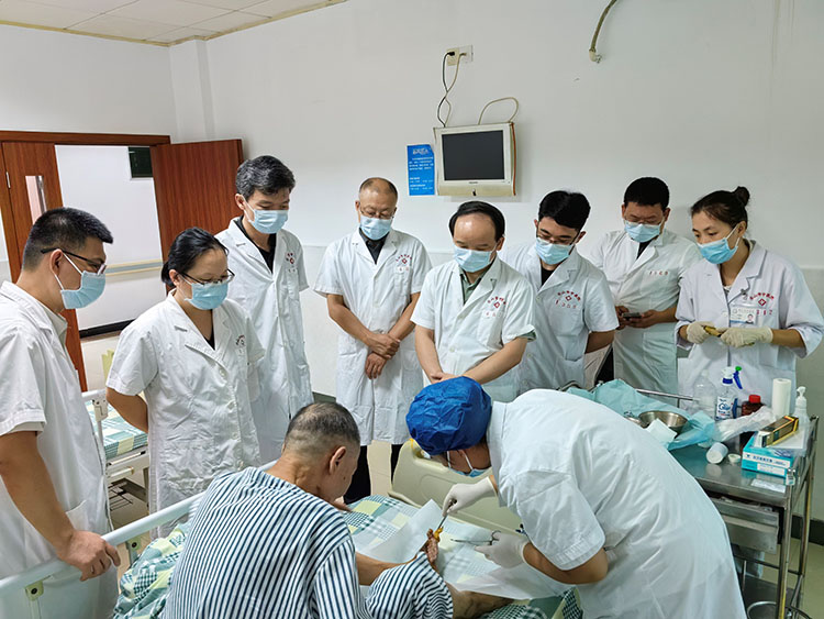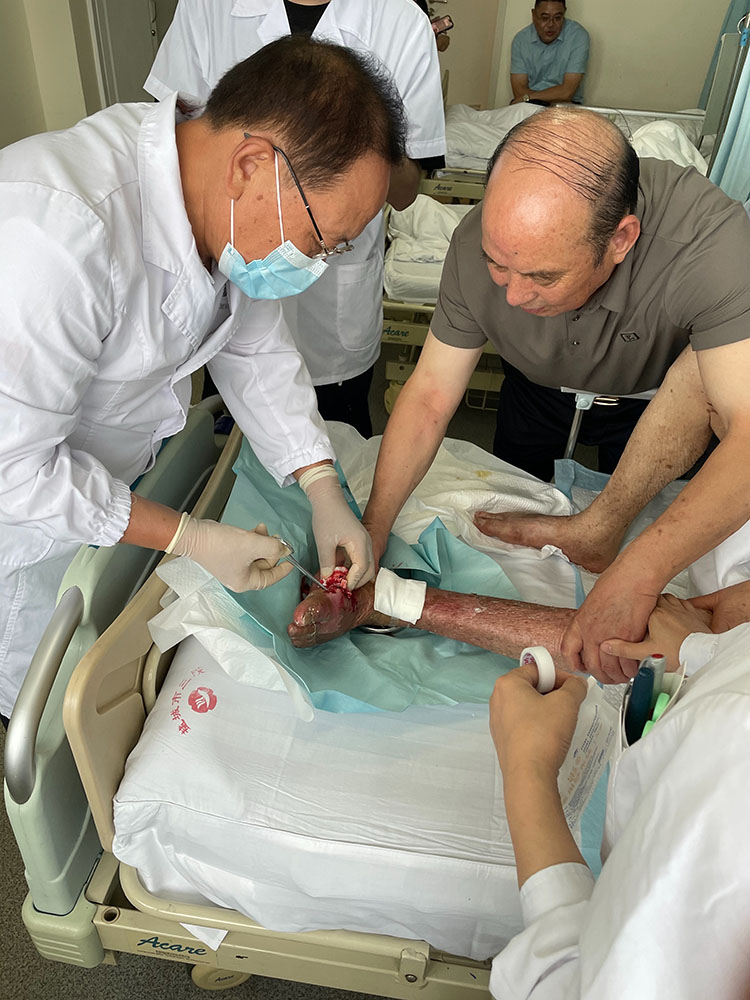 9月14日,中国中西医结合学会烧伤专业委员会常务委员,《中国烧伤创疡杂志》副总编辑王洪生应邀到清远市中医院手外科,对一例糖足患者、一例难愈性创面患者进行会诊,指导再生医疗技术的规范化应用。
