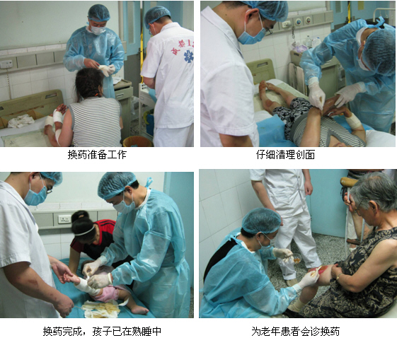 成都大学附属医院是位于成都市的三级甲等综合大型教学医院,2009年8月份曾在该院举办了再生医疗学术会议,会后该院在临床逐步开展湿性再生医疗技术,经过近一年的发展,该院成立了烧伤创疡治疗小组,现已将湿性再生医疗技术广泛地应用于烧伤、急诊创伤、皮肤溃疡、褥疮、糖尿病溃疡等病例,在临床上取得了非常好的治疗效果。目前该院烧伤患者数量有了明显的增加,今年7月,该院收治了一名中年女性,其烧伤面积为20%TBSA,其中有10%TBSA为深三度烧伤。患者不慎被开水烫伤,且由于地滑多次摔倒致擦挫伤,经过该院医护人员采用烧伤湿性医疗技术为该患治疗,患者大部分创面已经接近愈合,但深三度的创面愈合较慢,医院为保证患者得到最佳治疗效果,向四川省中西医结合学会烧伤专业委员会申请了专家会诊和指导。在接到医院申请后,学会立即联系了四川省中西医结合学会烧伤专委会副主任委员、雅安市人民医院烧伤科付子俊主任到成都大学附属医院会诊指导。付主任在接到通知后连夜赶到了成都,第二天早晨在成都大学附属医院急诊科梁隆斌主任和四川省中西医结合学会烧伤专委会朱春红同志的陪同下,来到该院病房会诊患者。看见专家从容、娴熟的治疗技术,病房里的其他烧伤和创伤患者及家属也纷纷表示希望付主任给予会诊,付主任逐一为大家进行了创面检查和换药,尤其是付主任在为一个一岁左右的小患者换药时,小孩安静地睡着了,病房的患者无一不被再生医疗技术的神奇和专家的技术所折服!