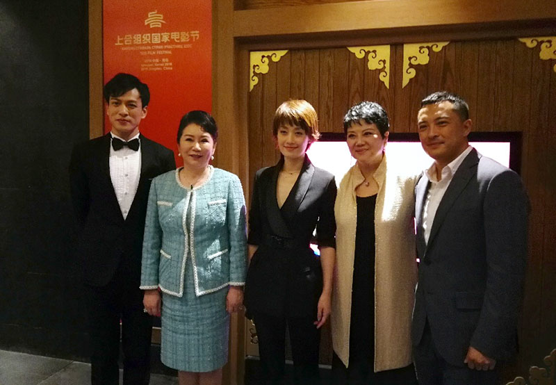 当晚,李俐(左二)作为胡玫电影《进京城》制片之一和导演胡玫(右二)演员富大龙(右一)演员马伊琍(中)演员马敬涵(左一)共同出席了上合组织国家电影节开幕式,拉开了此次将有近60部上合组织国家的优秀影片的展映和评奖,一场国际影视盛会就此开启。CCTV6电影频道对此次活动进行了全程直播。