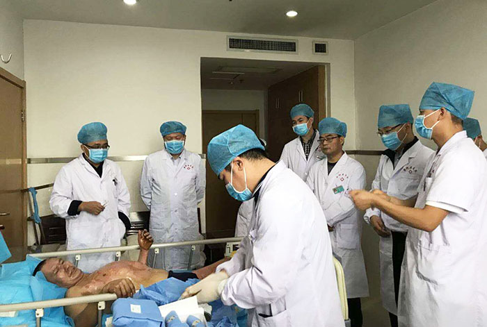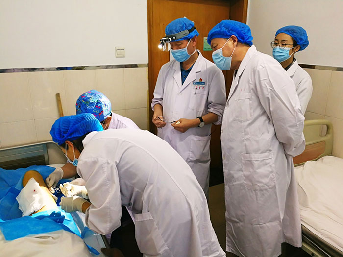 杨智斌总裁此行还会见了西安交通大学附属西安第九医院烧伤科肖厚安主任,该院作为陕西中西医结合学会烧伤专业委员会主委单位,在再生医疗技术的临床应用中取得了一定成果,特别是在再生疗法配合自体微粒皮种植技术治疗面积较大的皮瓣、组织缺损创面的应用方面,解决了传统烧伤、创面治疗缺少皮源这一难题。在肖厚安主任的陪同下,杨智斌总裁还现场观摩了微粒皮种植术临床应用,认真听取了该科室多年来应用再生医疗技术治疗的病例总结。
