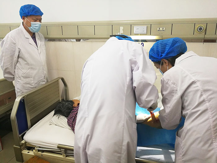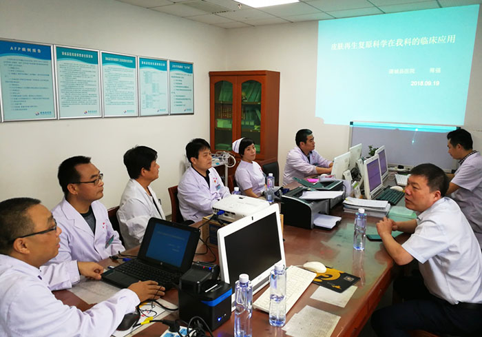 2018年9月19日上午,杨智斌总裁又在陕西中西医结合学会烧伤专业委员会刘华秘书的陪同下,对蒲城县医院进行参观访问。对烧伤科当前住院及门诊治疗的烧伤创疡病人治疗情况进行了实地考察,并就双方进一步合作与院领导进行了座谈。蒲城县医院以付强主任为核心全程规范应用再生医疗技术二十多年,治疗过的病人效果好、费用低,在渭南地区形成一定影响力。