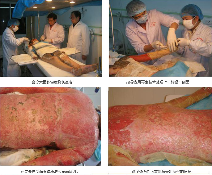 扩大烧伤再生医学的学术影响。2007年3月19日,在商洛市中医医院举办了“再生医学与烧伤皮肤再生技术”培训班,通过学习大家对烧伤皮肤再生技术在大面积深度烧伤的救治上有了更深的认识和了解。培训班结束后,医院邀请前来讲课的陈永翀副所长到烧伤科进行查房,重点讨论和制定了采用烧伤皮肤再生技术治疗传统干燥结痂的大面积烧伤患者的治疗方案。该患者是前段时间从西安军医大某附属医院转回来的,转入诊断:1、大面积特重度烧伤干燥保痂治疗后(TBSA=85%,III度65%);2、吸入性损伤气管切开术后;3、低蛋白血症。经过讨论,大家一致同意选择和改用治疗痛苦小、能促进创面愈合、费用低、能减少瘢痕和残疾的烧伤皮肤再生技术给患者治疗。