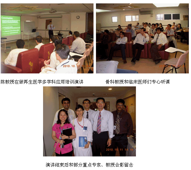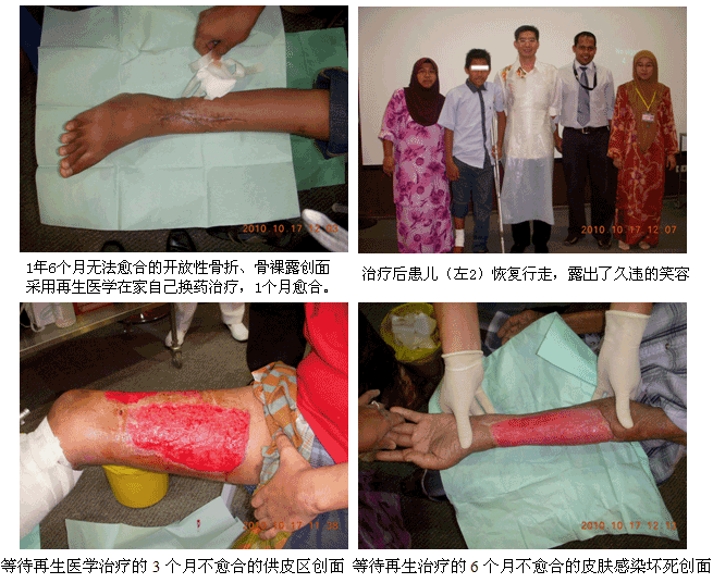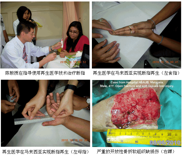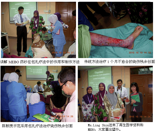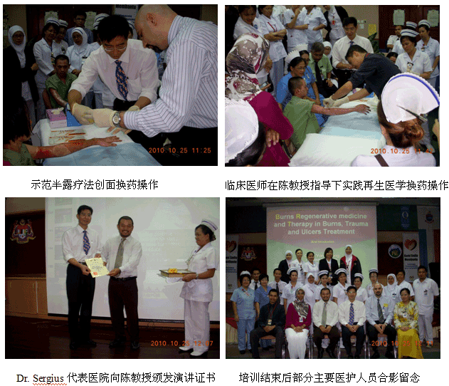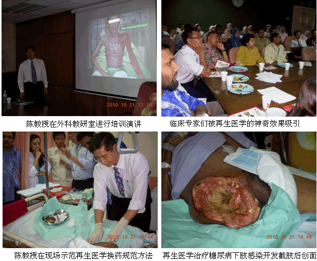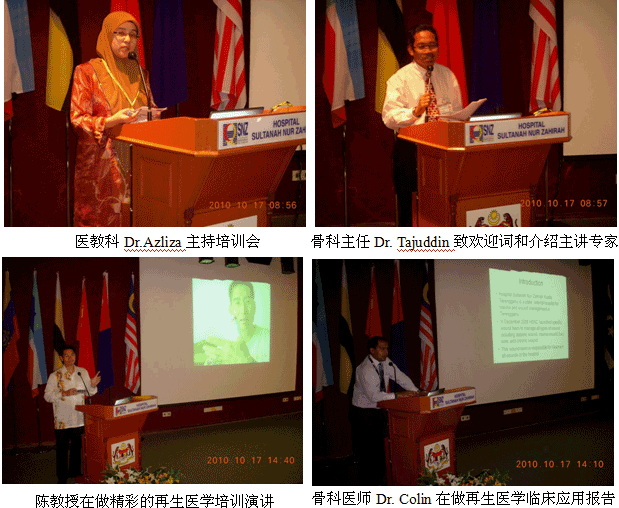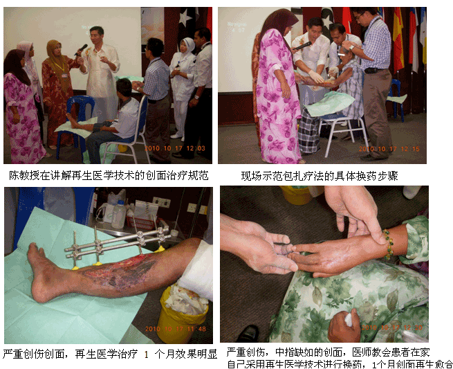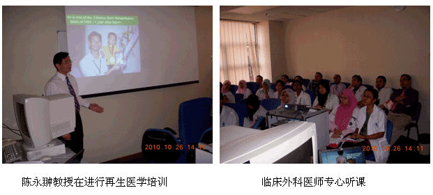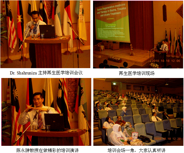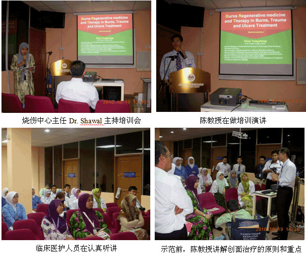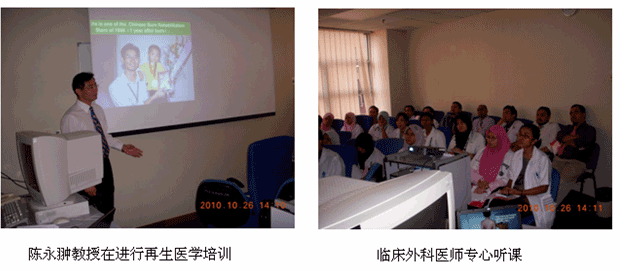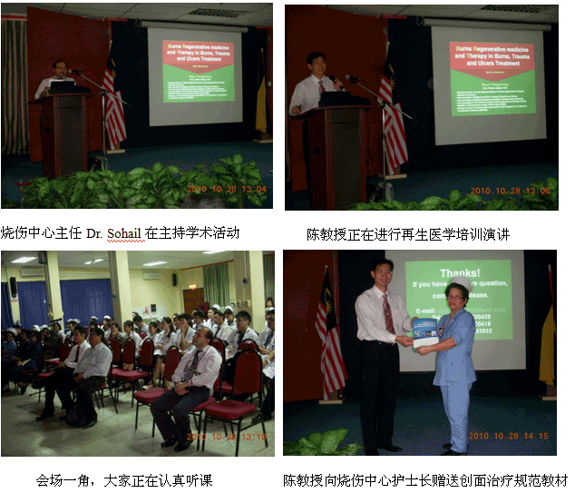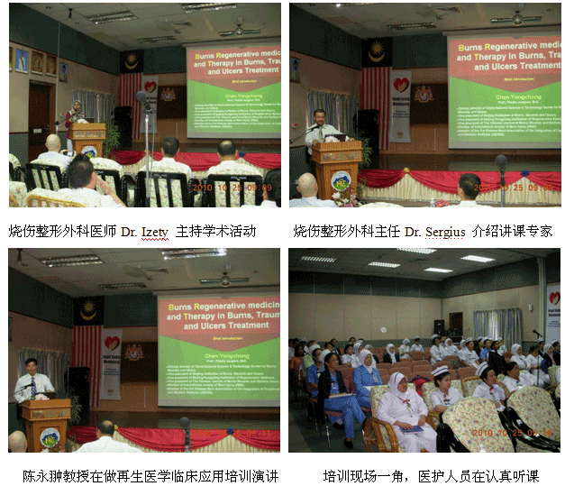 自从再生医学学术演讲在今年年7月在马来西亚Kuching举办的亚太估计整形大会上引起轰动和强烈反响后,再生医学的学术地位和影响力在亚太地区,特别是在马来西亚得到了明显提升。为了发挥出学术的优势,趁热打铁在马来西亚推广再生医学技术,2010年10月10日至29日,马来西亚今年的第三轮医疗开发与维护工作顺利展开,收效显著。在20天的时间里,先后举办了州级(省级)培训班2期,院级培训班7期,培训了烧伤、整形、普通外科、骨科、内科的医师和护士580余名;对 5家老基地医院的临床应用与技术规范进行了有效的维护、推进和提高;成功新开发了4家新的大型政府教学医院和1家大学医院;会诊、指导30多例危重疑难病例的救治[烧伤7例(特重度烧伤2例),创伤13例,慢性溃疡11例,皮肤病1例,等],医疗开发与维护齐头并进。