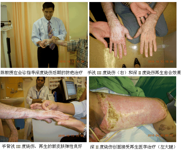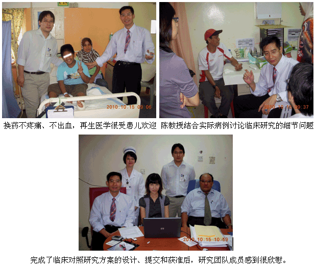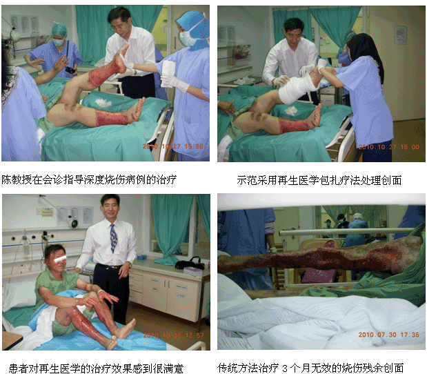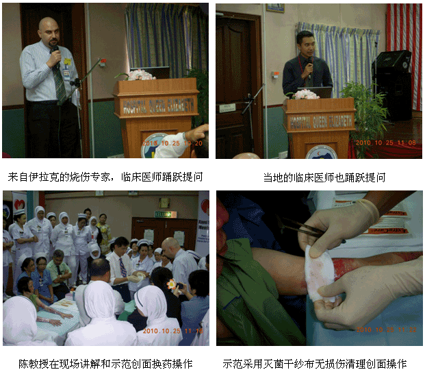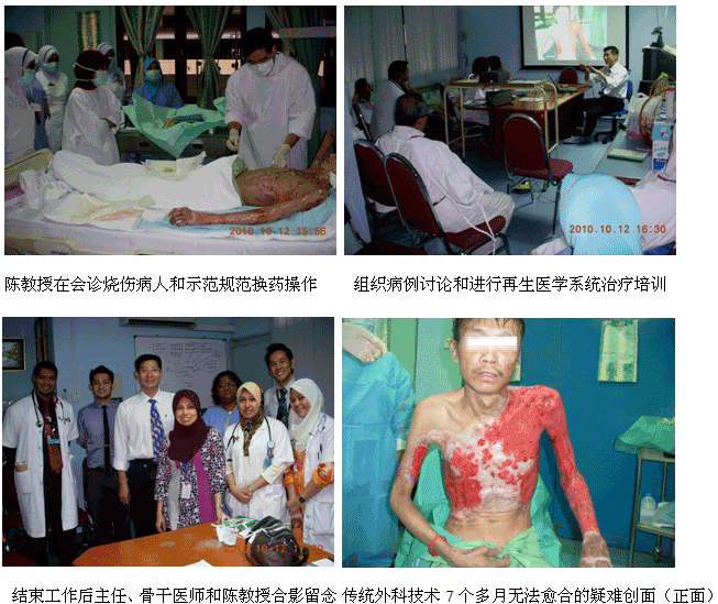 1、2010年10月11日上午7时30分,来自中国烧伤创疡科技中心的陈永翀主任和负责马来西亚学术推广和医疗开发的Ms. Ling Shin Chew,应马来大学医(UMMC)烧伤科负责人Dr. Margaret的邀请,来到了该院的外科病房会诊和指导了3例疑难烧伤创疡患者的治疗,实现了很好的维护、提高再生医学技术水平的效果。