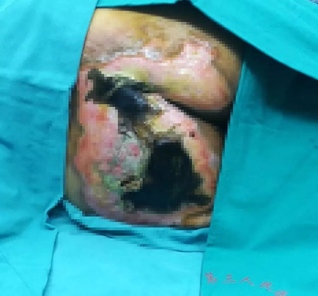 患者胡XX,今年81岁,中风后导致左侧肢体瘫痪。2017年11月份,用中药熏蒸臀部,不小心烫伤皮肤,导致他双侧臀部起了水泡。自行买药外敷后情况没有好转,并逐渐出现皮肤脱落、红肿加重的状况,臀部受压几天后,情况更加严重,局部皮肤坏死变黑了。