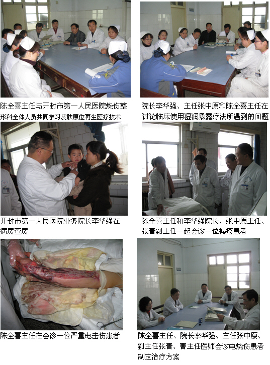 2010年4月18日,北京创疡研究所副主任医师陈全喜应河南省开封市第一人民医院的邀请,来到该院的烧伤整形科为该科室的医生们进行再生医疗技术培训。会议开始前,陈全喜主任在李华强院长的陪同下一同到病房为患者进行会诊,针对个别病例与医生们一起探讨,并制定治疗方案。该院的业务院长李华强、烧伤科主任张中原在培训讲座开始前,向大家简单地介绍了陈全喜主任及再生医疗技术在烧伤、创伤与溃疡治疗领域所取得的辉煌成就,并强调了学习再生医疗技术的必要性。