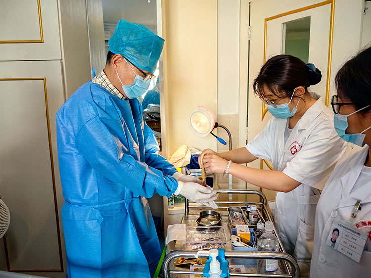7月12日,应余干县中医医院普外科吴主任邀请,《中国烧伤创疡杂志》编委、烧伤创疡再生医疗技术临床专家金党军,应邀到科室会诊一例臀部创面难愈患者,金教授在采用再生医疗技术进行治疗时,强调规范的换药流程是确保治疗效果和患者舒适度的关键。通过金教授亲自指导皮肤再生医疗技术换药流程,该科室确保了患者伤口得到良好的治疗和护理。规范的换药流程不仅有助于促进伤口的愈合和修复,还能提高患者的舒适度和满意度。金教授在与吴主任交流过程中双方高度共识,并表示要继续秉持专业、细致、贴心的服务理念,为更多患者提供优质的医疗服务。