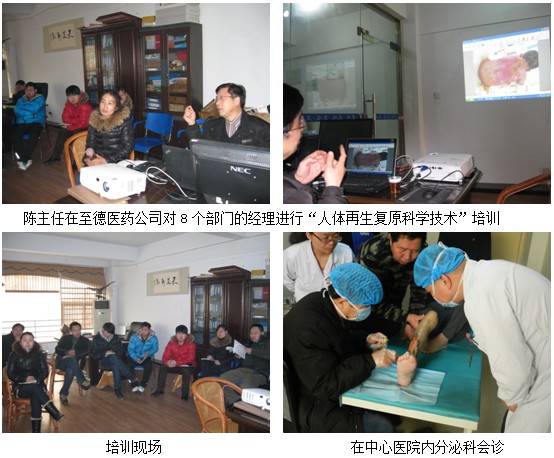 2013年元月18号下午2点,中国中西医结合学会烧伤专业委员会委员陈全喜主任医师在新乡市至德医药公司对8个部门的经理进行了“人体皮肤原位再生医疗”技术的培训。