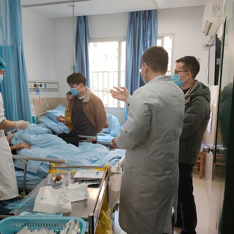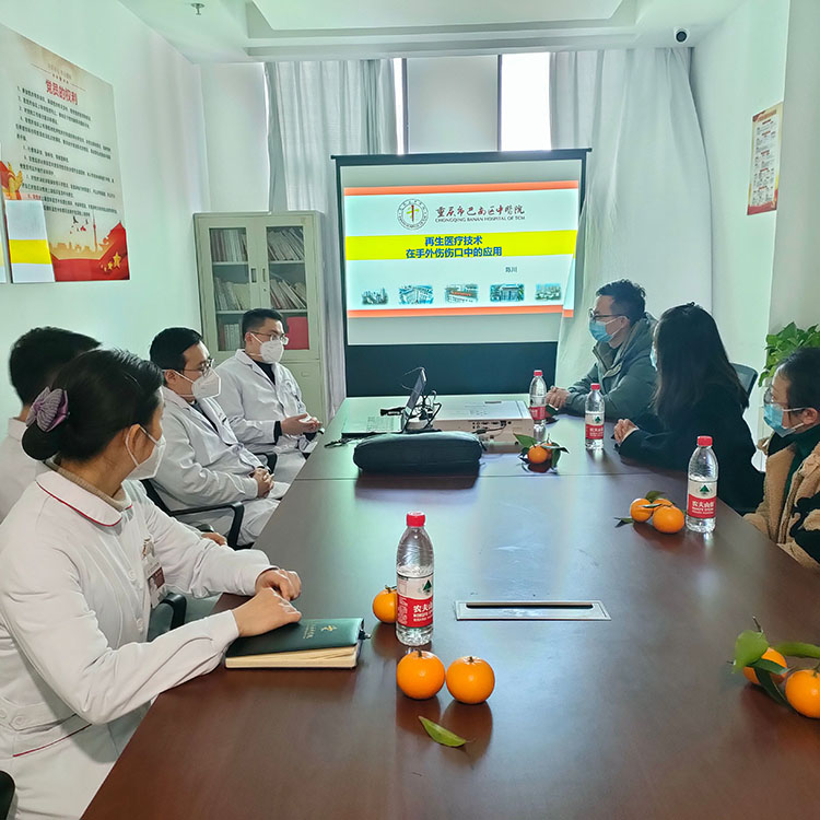 1月6日, 重庆市南岸区古医院林顺朝主任带领科室罗医生到九龙坡区第二人民医院创疡中心科室参观学习,会上张孝平主任进行了科室收治的一些案例分享,林主任对再生医疗技术的神奇疗效表示赞叹,并在听到张主任的技术分享后提高了后续对病人的治疗信心。之后去病房观看了烫伤和颈墉病人的现场换药等,对再生医疗技术有了新的认识。