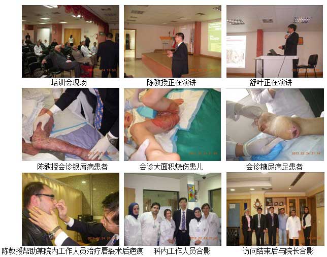 3. 2月24日9点,受到DAR AL-AMAL UNIVERSITY HOSPITAL医院的邀请,美宝团队赶到距离贝鲁特2个小时车程的贝尔贝克市进行产品推广。该医院是一所私立大学附属医院。在为20余名该院各科高年资医师做完再生医学技术和产品介绍后,陈永翀教授在整形科主任的陪同下为三例患者进行了会诊。第一位是老年银屑病患者并发溃疡伴全身多器官功能障碍;第二位是一个8岁学龄期儿童,三度大面积烧伤患者;第三位是老年糖尿病溃疡患者。在看完病例之后,陈教授给予一一解答,再生医疗技术可以解决上述全部问题,只要进行规范的创面处理并进行合理的系统治疗,所有病人的创面都可以最快速度的愈合。他同时建议银屑病患者脱角质创面可以尝试使用美宝疤痕平软膏,将会得到意想不到的效果;大面积烧伤患儿要及时清除液化坏死组织;糖尿病患者要积极控制血糖水平。