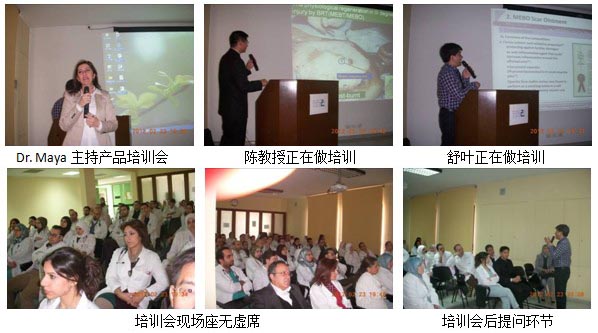 2. 2月23日早上10点半,美宝推广团队再次来到赛达市,为当地一家私立大学附属医院Hammoud Hospital的医务人员进行专门的疤痕软膏培训。培训会由Dr. Maya主持,Dr. Maya是药学的博士,现在负责美宝所有产品在黎巴嫩的经营工作。医院共计有60余名医生、药师、护士参加此次培训会。当医生们看到再生医疗技术及其配套产品在抗疤领域所取得骄人成绩时,详细地询问我们的产品和现在主流的产品硅胶贴有何不同等相关问题。负责产品推广的舒叶解释说,硅胶贴和疤痕平在抗疤的原理上有一小部分是相似的,那就是两种产品都能保持创面的湿润。但是硅胶贴使用合成的材料来保持创面湿润,而疤痕平却是用独特的由天然成分蜂蜡和麻油组成的框架剂型来保持接近于正常皮肤水分丢失来保持创面湿润,这是硅胶贴产品所不能比拟的;除此,疤痕软膏中各种物质能提供给细胞各种必需的营养成分,调节胶原蛋白正常生长,以此来达到预防和治疗疤痕的效果。