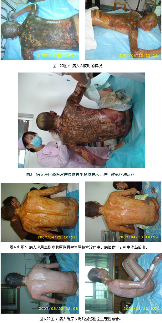 2007年4月13日13时04分,广州花都中医院收入一例成人烧伤,该患者苏某某,男性,23岁。以“高温漆料烫伤全身多处伴疼痛1小时”为主诉急诊入院。患者于入院前1小时工作时,不慎被高温脂类化学漆料烫烧伤全身多处,现场未作特殊处理,遂到花都中医院急诊求治,入院查体见:T36.0℃,P82次/分,R20次/分,BP120/90mmHg,神清,急性痛苦面容,头、面、颈、双上肢、躯干、臀部皮肤焦黄,炭化,部分表皮撕脱,表皮撕脱处可见创面苍白,呈蜡白样,间焦痂样物,无水疱,无渗出,触痛迟钝,面部见表皮破溃,少理脱落,红白相间,触痛明显,双眼睑毛烧焦状,双眼粗测视物无明显异常,右耳轮呈苍白色。入院诊断:高温漆料全身烧伤总面积32%TBSA(深二Ⅱ度11%、浅Ⅲ度21%),特重度烧伤。入院后对患者创面处理全程应用我国著名生命科学家徐荣祥教授发明的烧伤皮肤原位再生医疗技术,进行抗休克、抗感染、营养支持、脏器功能保护等全身综合治疗,并在中国中西医结合学会烧伤专委会常委、北京烧伤创疡研究所副所长、临床部王洪生主任的全程临床指导下,患者顺利的度过了休克关、感染关,深Ⅱ度及浅Ⅲ度创面分别于伤后3周及5周左右生理性愈合。该患者的成功救治充分证明了烧伤皮肤原位再生医疗技术的显著临床治疗效果。