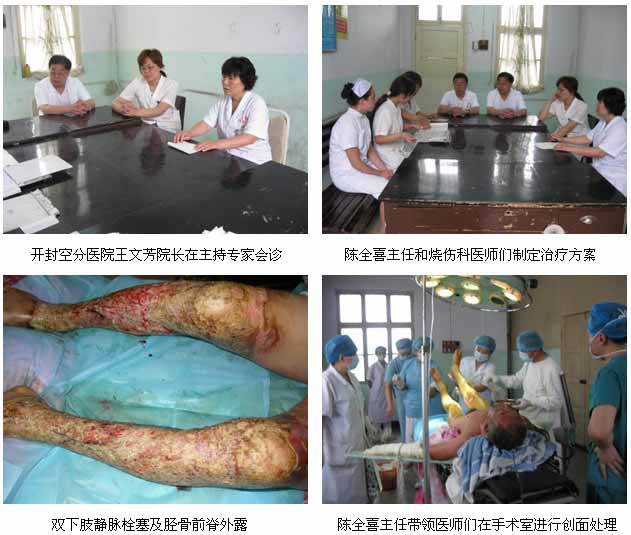 2011年7月2日,北京美宝烧伤创疡研究所临床部专家陈全喜主任应邀来到河南开封空分集团有限公司医院会诊一位严重烧伤患者。患者:张某某,男,64岁。入院诊断:双上肢、双下肢深Ⅲ度烧伤,烧伤面积44%TBSA。患者入院时基本情况:面色苍白,四肢冷,皮肤干燥,脉搏100次/分,呼吸29次/分,血压80/60mmHg,烦躁。经会诊后陈主任指导院方制定了抢救方案。入院立即应用皮肤原位再生复原技术治疗,包括抗休克、保护心肾功能等系统治疗;创面减张,湿润烧伤膏油纱条半暴露治疗;保护肢体血液循环,防止创面损伤加深等措施。待病情稳定后于2011年7月4日上午,在王志英副院长、郑玉红主任和陈全喜主任一起为患者进行了减张耕耘术治疗,术后应用再生医用复合敷料-美宝创疡贴对患者的创面进行了包扎,并根据病情及时换药。目前患者病情稳定,正在进一步的治疗中。