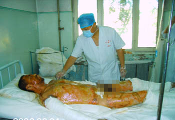牡丹江市第一人民医院(三甲)是东北边陲一所综合实力较强的核心基地医院,担负着该片区临床培训,新技术推广等任务。姜月虎主任运用徐教授发明的美宝再生科学理论和烧伤皮肤再生医疗技术,成功的治愈数例90%以上大面积烧伤病人,其中两例被评康明星。今年8月份又成功的救治一例大面积烧伤病人。患者闫某,男、30岁、8月17日被汽油火焰烧伤,TBSA90%,其中深三度30%,深二度60%、入院后严格按照烧伤皮肤再生医学临床手册规范要求,采取积极有效的抗休克复苏措施,对深三度创面应用簿化技术 ,使患者平稳度过危险期,通过近阶段的治疗目前患者生命体征平稳在康复治疗中。