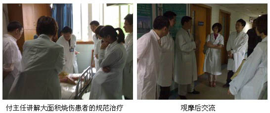 2011年6月1日,大邑县骨科医院急诊科曹林主任和黄蓉护士长等一行6人在四川省中西医结合学会烧伤专委会朱春红同志的陪同下,来到雅安市人民医院烧伤整形科参观学习,雅安市人民医院烧伤整形科付子俊主任热情的接待了来宾,付子俊主任陪同大家来到病房,曹林主任一行认真观摩了大面积深度烧伤患者和创疡患者的再生技术规范治疗,同时还通过临床观摩付子俊主任就临床的病人治疗要点、治疗注意事项等向他们做了详细的介绍和讲解。临床观摩后付子俊主任在医生办公室和大家交流,他向大家介绍了雅安市人民医院和科室发展情况,同时将自己使用再生医疗技术的心得毫无保留的传授给大家,对大家提出的问题一一做了详细解答。曹林主任激动的说:这次雅安之行收获特别大,非常感谢省学会和付主任的帮助和支持,回去后一定用再生医疗技术为患者造福。