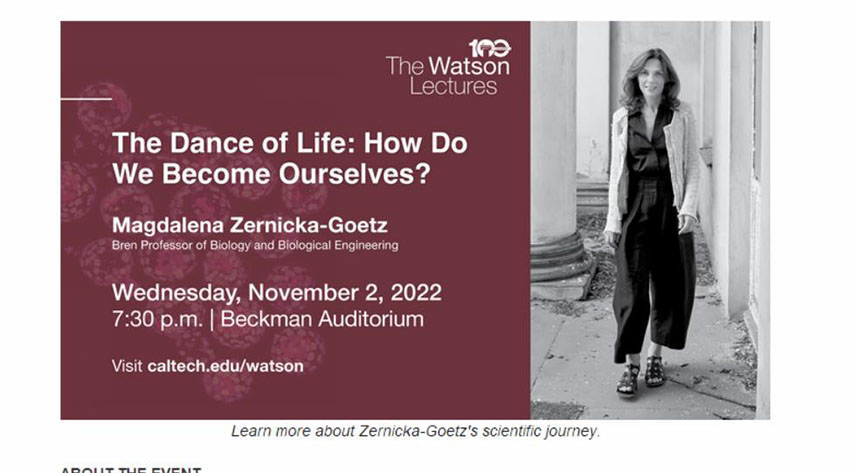 在2022年11月2日举办的加州理工学院一百年前设立的沃森讲座(The Watson Lectures )上,加州理工学院遴选来继承徐荣祥科学精神和路线的陈天桥雒芊芊神经科学研究所发育生物学家、Bren生物学和生物工程教授玛格达莱娜·泽尼克-戈茨(Magdalena Zernicka-Goetz)就“生命之舞:我们发育成人的旅程”进行了分享。该讲座采用线下线上相结合的方式进行。