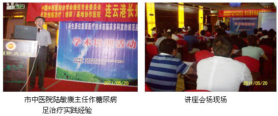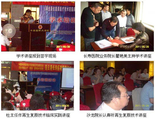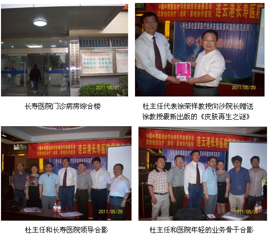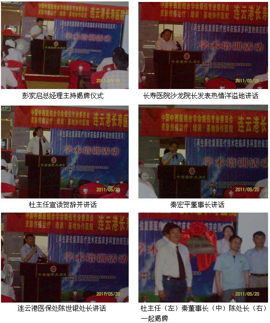 2011年5月20日上午8:00时,在连云港千府大酒店会议厅举行了连云港长寿医院为皮肤原位再生复原医疗技术的培训医院揭牌仪式暨皮肤原位再生复原医疗技术培训学术讲座,中国中西医结合学会烧伤专业委员会常委、北京美宝烧伤创疡研究所临床部杜福勤主任和学会驻江苏省办事处刘恒主任,连云港苏云集团秦宏平董事长、彭家启总经理、连云港医保处陈世银处长、沙龙院长、瞿艳美业务院长及邀请的有关医院的专家和医护人员共60余人参加了揭牌仪式。