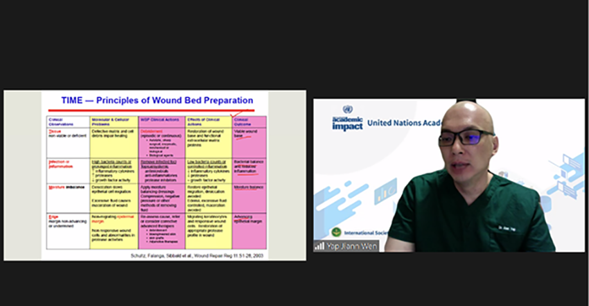 首位演讲嘉宾是来自马来西亚的Dr. Yap。Dr. Yap是马来西亚创面医师协会副主席、马来西亚Queen Elizabeth医院创面科主任。他的演讲题目为《创面评估》,在演讲中,他详细地介绍了创面的主要评估指标以及创面床的准备等。