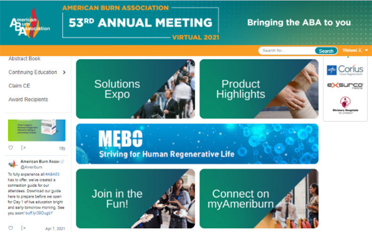 ABA线上会议不仅为烧伤领域的专家提供了良好的学术交流机会,也为各企业展示其产品与技术提供了广阔的平台,来自全球的40多家知名医药企业参加了此次会议。自2016年以来,美宝国际已经连续4年参加了ABA年会:第49届波士顿年会、第50届芝加哥年会,第51届拉斯维加斯年会,以及2020年线上会议。今年,美宝国际再度受邀参加2021年ABA线上会议,与全球专家和企业一道,探索与推动烧伤治疗的未来发展,并将继续以再生生命科学领航者的身份,促进全球再生生命科学的持续发展与科技创新。