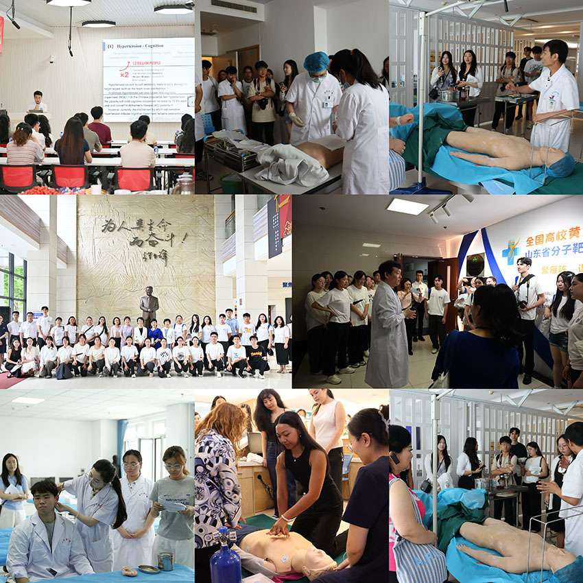 7月7日,本次访学之旅在山东烟台滨州医学院拉开帷幕,师生们受到热情接待,参与了隆重的欢迎仪式并参观了校史馆及荣祥楼,在徐荣祥教授铜像前共同献花,深切缅怀这位再生医学领域的先驱。在烟台期间,行程丰富而深入大家开启了学术碰撞,在护理学院、第一临床医学院组织了多场英文学术汇报,主题涵盖肠道菌群与高血压认知、mHealth在HIV预防中的应用、徐荣祥再生医学理论探索等前沿领域,中美师生积极互动。
