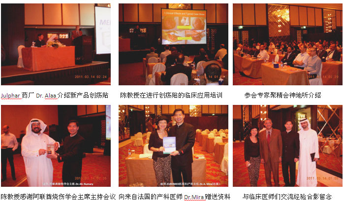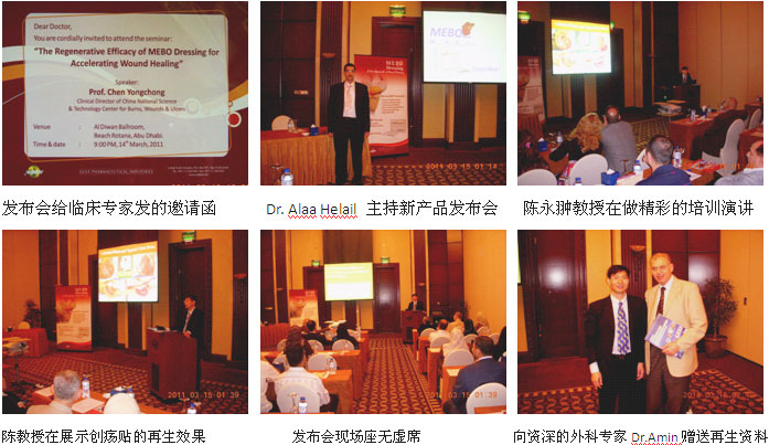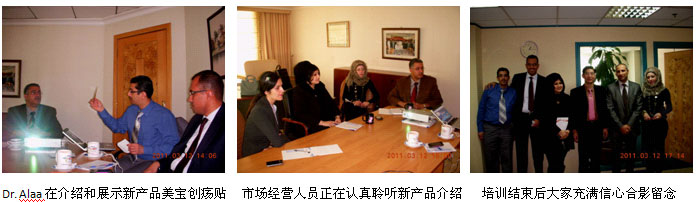 经过美宝国际市场集团孙霞总经理、市场部刘钢和吴云经理与阿联酋海湾JULPHAR药厂的积极联络、组织、策划和安排下,分别在阿联酋的第一大城市迪拜市和首都阿布扎比市展开了一系列的美宝创疡贴新产品发布会、应用培训和临床示范指导等活动,使更多的临床医护人员了解了美宝创疡贴的再生愈合效果和掌握了具体使用方法,美宝创疡贴很受临床医护人员和患者的欢迎,同时为新市场的开拓打下了较好的基础,打响了除烧伤膏之外的另一再生医学新产品的海外开发、经营的第一炮。一、欲其事必先利其器。2011年3月12日,为了做好美宝创疡贴的经营和启动工作,海湾JULPHAR药厂和阿联酋负责美宝产品经营的人员主动放弃周六休息的时间进行产品知识培训。中国烧伤创疡科技中心临床部的陈永翀教授给大家讲解了美宝创疡贴的再生医学机理、临床使用方法和临床效果,Dr. Alaa Helail则向大家做了美宝创疡贴新产品的介绍,期间大家还认真讨论和确定了接下来的几天在迪拜市和阿布扎比市的医疗开发与产品发布会的具体安排。通过这次培训,使经营人员了解和掌握了美宝创疡贴的再生愈合机理、效果,以及与其它同类竞争产品的区别与优势,大家对该产品的经营充满了信心。