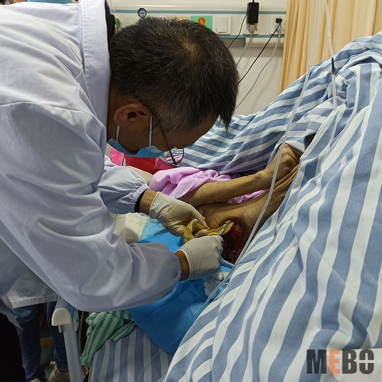 培训结束后,方教授指导医护人员为糖尿病足及骨髓炎患者清创,应用再生医疗技术及湿润烧伤膏做油纱换药治疗。