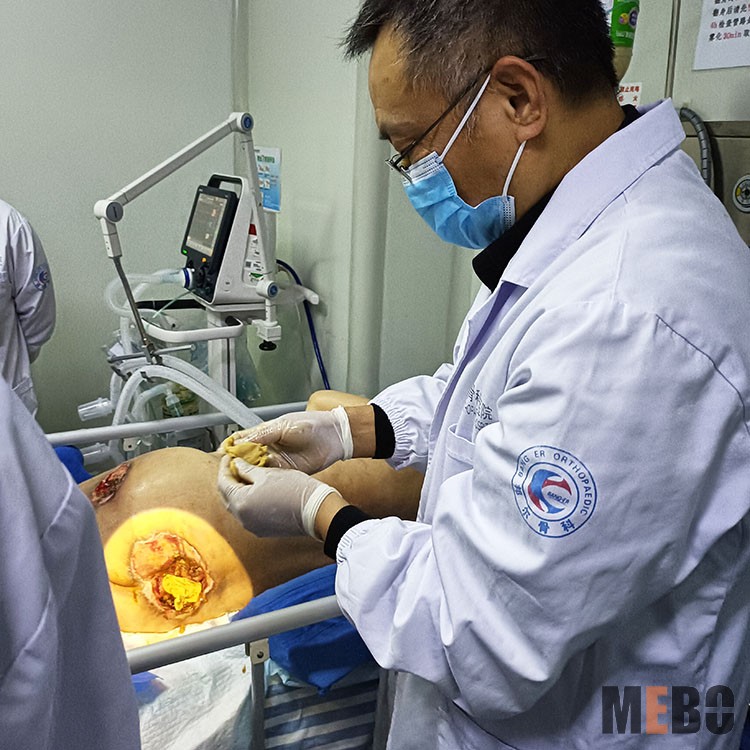 4月12日早晨,方教授应邀前往杭州市萧山区中医院,与普外科杨主任及ICU主任一起会诊病人,并指导医护人员应用再生医疗技术及湿润烧伤膏产品治疗50%大面积烧伤病人。该病人为高压电击伤、三度创面为主。