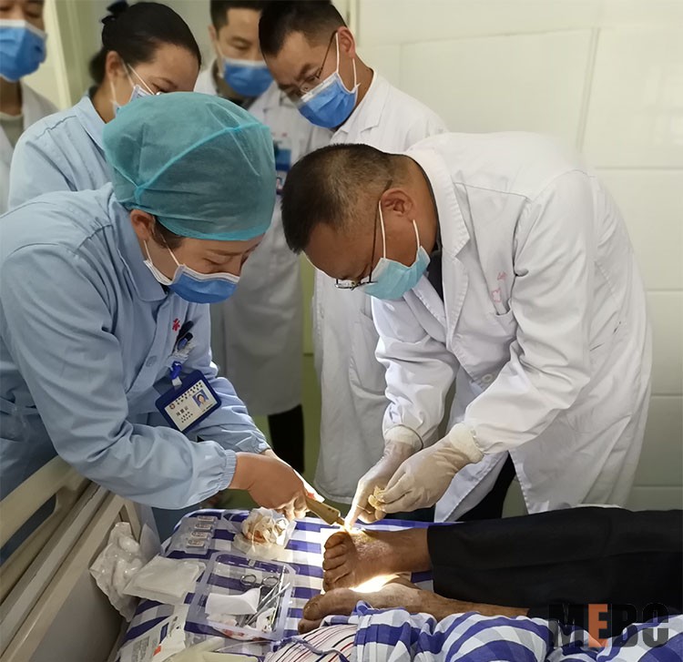 方教授在云和县人民医院,指导医护人员为4级糖尿病足病人清创,应用再生医疗技术及湿润烧伤膏换药治疗。