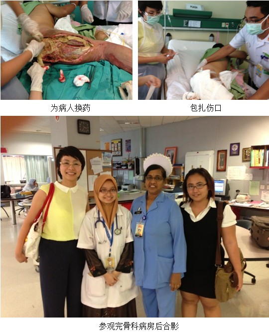 继续教育项目开始前,我们拜访了马来国大医院((Hospital Universiti Kebangsaan Malaysia)烧伤科主任Dr. Farrah及护士长,参观了烧伤科病房,了解了医务人员的学习需求,时逢Dr. Farrah 有一外科病人需要会诊,该病人72岁,女,头顶部有一肿瘤,切除四天,病理结果仍需2个星期,会诊后,决定让病人使用再生疗法,因为美宝烧伤膏不是该医院的基药,医生不能直接开处方,只能病人自己买了拿来换药,因此,张美艳及Noliza在科室等了病人家属2个半小时,成功介绍病人使用美宝烧伤膏!并计划跟踪随访该案例!