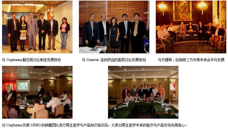 2009年10月22日至29日,为了在原有的OTC市场的基础上,进一步扩大MEBO在叙利亚各医院的使用范围,并推广到临床多学科应用,美宝国际部孙霞总经理、国际部商务部刘钢经理和中国烧伤创疡科技中心临床部陈永翀主任一行,长途奔波来到叙利亚首都大马士革市,向代理商、经销商的高层领导介绍了再生医学的研究应用新进展,共同商讨制定了下阶段的医疗开发计划和市场增长目标,3方达成了战略共识,并马上展开和实施了一系列的技术培训、专题演讲和临床技术指导等工作,此次访问反响热烈、收效明显,预示着叙利亚的医疗开发工作已经进入了新的时期。下面以图片的方式做一个简要报道: