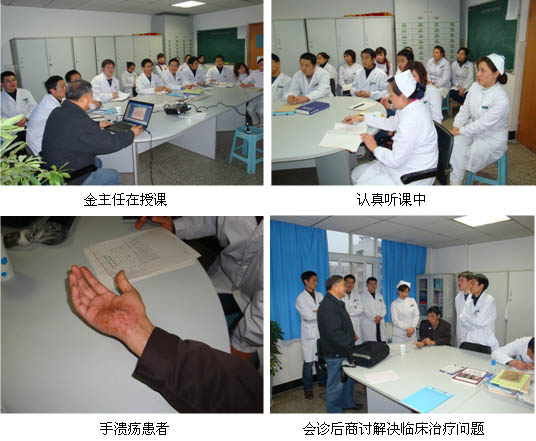 学术会议由戴主任主持,金教授先向大家介绍了烧伤及烧伤皮肤原位再生医疗技术的概念,而该技术是由湿润暴露疗法和湿润烧伤膏来共同完成;介绍了暴露疗法创面处理的原则、处理方式、规范换药技术以及各类深浅度烧伤、溃疡、褥疮、糖尿病足、断指再生等创面的处理方法;并通过展示大量真实的临床病例图片,使大家真正了解皮肤原位再生医疗技术及其再生产品的先进性、实用性;随后金教授介绍了再生医疗技术新产品—创疡贴对压疮、糖尿病足溃疡等创面的治疗,并介绍了其作用原理、产品组成结构、各类创面使用的方法等;还着重讲解了在5.12四川灾区应用再生医疗技术治疗众多患者所取得的良好疗效。在金教授课结束后,参会人员结合实际工作中所遇的问题纷纷提问,如取皮后,使用湿润烧伤膏或速愈贴遇渗血情况如何处理,烧伤膏油纱条如何制作,III度烧伤创面是否采用包扎疗法等,现场气氛十分活跃,金教授一一为大家做了细致回答,并在会议结束后对一位手部创伤患者进行了会诊。