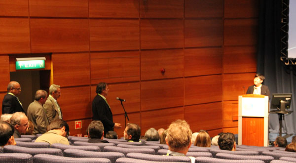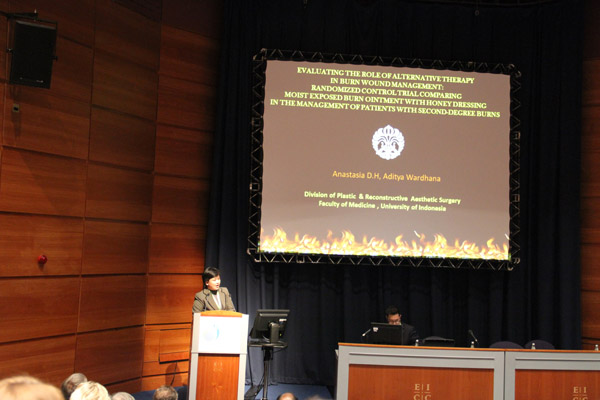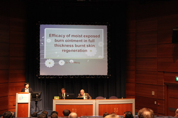 在下午的自由发言中来自印度尼西亚大学的Anastasia Dessy 医生以再生医疗技术与蜂蜜敷料在二度烧伤创面的对比进行了演讲。她通过两种方法在创面愈合时间,愈合质量,以及愈合后疤痕情况等等几个方面进行了全面对比研究。并得出结论两组对比发现再生医疗技术组愈合时间明显缩短同时患者痛苦小但创面愈合质量高,同时指出,在他们医院之前的研究中已有蜂蜜辅料对传统SSD的对比试验,结果显示蜂蜜辅料组明显优于SSD组,因而其结论是:MEBO是在创面治疗中的最佳选择。在场与会专家非常认可并接受这种非常严谨的科学对比试验,对美宝的结果表示信服,同时通过上午的发言对再生医疗技术已经有了一定的了解,因此提出更为深入的问题,如到底“美宝”是什么?(美宝的成分)以及其药理,愈后疤痕治疗评价等等问题。Anastasia医生以她的理解一一给予解答。
