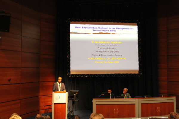 接下来,来自印度南部最大烧伤中心的主任Jayraman 医生做了题为再生医疗技术在烧伤创面治疗的经验的演讲。演讲过程中Jayaraman主任总结了此项技术的极大优势例如保持创面湿润环境,抗炎抗感染以及痛苦小等等优点。同时也展示再生医疗技术在印度临床试验过程收集的多个病例,通过生动鲜活的病例折服了在场所有观众。特别需要指出的是,Jayraman 主任对美宝的再生机理给予了详细的解释,从潜能再生细胞到干细胞,从再生环境到再生技术,给与会专家又一全面的美宝科学的展示。在回答问题的环节,Jayraman 主任与与会代表探讨了烧伤愈后色素沉着的测量方法,美宝作用下干细胞再生的发生部位和过程等等,无论是提问还是回答,都相当精彩!