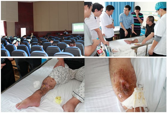 随后,王洪生主任应邀来到外科病房,为一例右小腿断肢再植后并骨外露患者和一例难愈合创面的病人会诊,指导对两位患者的创面的治疗,在病房中现场教授医生们如何运用再生医疗技术来规范化处理治疗难愈性创面。