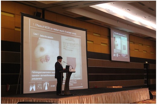 第三天会议继续进行,来自中国中西医结合学会烧伤专业委员会国际部主任舒叶被安排在全体会议中第一个发言。他演讲的题目是再生医疗技术在癌症创面的应用,这一世界性难题用美宝再生科学的解决吸引了所有与会代表的眼球。舒叶主任先从再生医疗技术成功治疗典型病例入手,深入分析三例皮肤癌患者在手术切除、放疗等治疗后,残余创面应用再生医疗技术成功抑制创面残余癌细胞生长的病例。然后,重点展示对癌症细胞在再生物质环境下分别培养和共培养结果的基础研究。单独培养的结果表明再生物质环境下,癌细胞会快速死亡;非再生物质环境下,癌细胞会迅速增殖分化,正常细胞会迅速被癌细胞吞噬。癌细胞和正常细胞的共培养结果显示,在再生物质环境下,正常细胞会逐渐增殖、分化形成新的组织;而在对照组中,癌细胞会迅速扩张,正常细胞消失。基础研究的结果表明再生物质具有抑制并杀死癌细胞,同时促进正常细胞生长的双重功效。结合临床真实的病例展示,再生医疗技术在癌症方面的功效及研究吸引了全体与会人员的关注。会后,多名医生询问具体情况,并索要相关论文,要在当地开展使用。