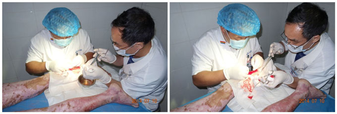 培训结束后,赵瑞庆教授针对运动医学科等科室医务人员提出的临床问题,分别作了新鲜伤口正确使用创疡贴、早期防治疤痕的耐心解答。赵瑞庆还在烧伤整形科,为铁水烧伤的病人李某某做了残余肉芽创面皮簇种植术的示范操作演示。烟台山医院本次培训手术演示,对该院开展多科室使用烧伤创疡再生医学与疗法起到了很好的推动作用。