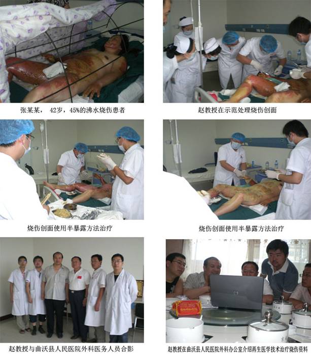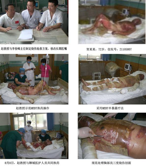 简讯1:8月6日,应山东聊城中医院外科邀请,赵瑞庆教授第一时间赶到该院,指导使用MEBT技术抢救了一例烧伤面积72﹪TBSA的酒精烧伤病人,与该院外科医务人员共同制定抢救方案,亲自示范再生技术操作换药,规范简易烧伤病房管理。