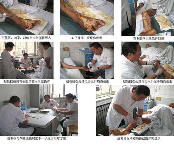 简讯2:8月9日,赵瑞庆教授指导山东牟平人民医院外科医务人员使用再生医学技术治疗380伏高压电击伤造成右手、左下肢、会阴部Ⅲ度烧伤患者。