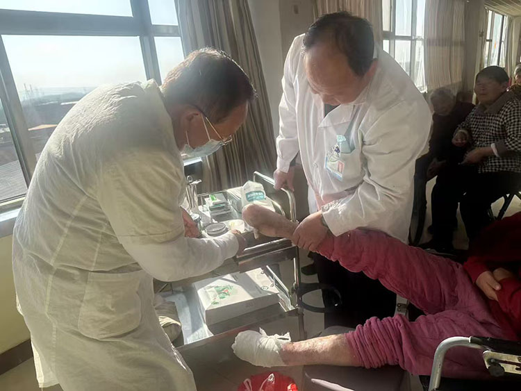 1月7日,应玉璧敬老院邀请,《中国烧伤创疡杂志》常务编委、烧伤创疡再生医疗技术临床专家赵瑞庆教授在该院会诊两例高龄慢创患者(一例双足部压疮,一例足跟部压疮),并向当地医务人员详细说明了后续治疗注意事项。