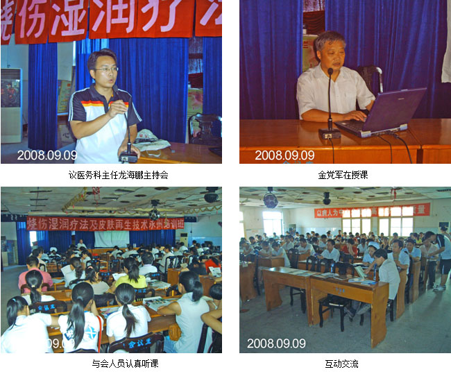 2008年9月9日下午2点30分,由永州市中医院承办的《烧伤再生医疗技术诊疗与护理学习班》在湖南永州市举行,永州市多家各级医疗单位的150多名科主任、相关专业的学科带头人、专家和业务骨干参加了学习班。学习班开始前,举行了简短的开幕式,由永州市人民医院医务科主任龙海鹏主持,并代表院领导致贺词。