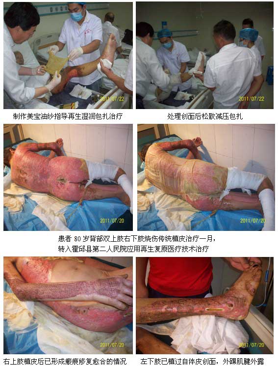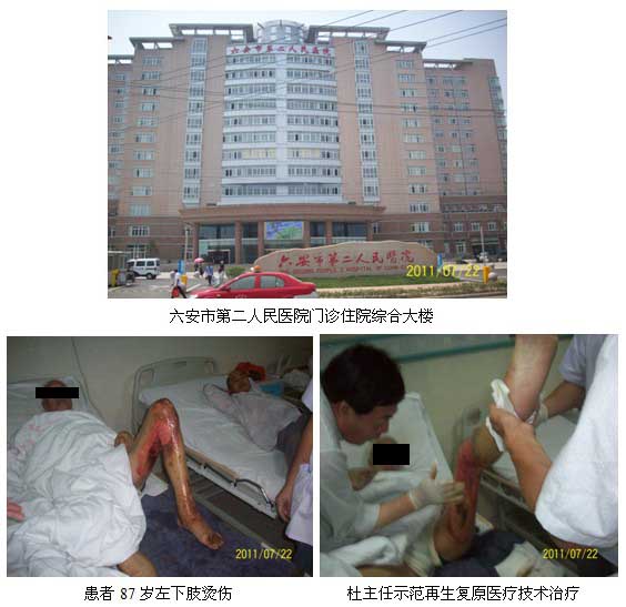 7月22日,杜主任走访了六安市第二人民医院外科、第一人民医院烧伤整形科,与二院涂苍慨主任深入交流再生复原医疗技术的发展和临床实践情况,下午为一名87岁老年烧伤患者示范再生复原医疗技术换药。同时还走访了一院烧伤整形科和赵遵江主任交流了再生复原医疗技术最近的研究成果和国内外临床实践可喜的成果,达到了深入推广再生复原医疗技术的目的。