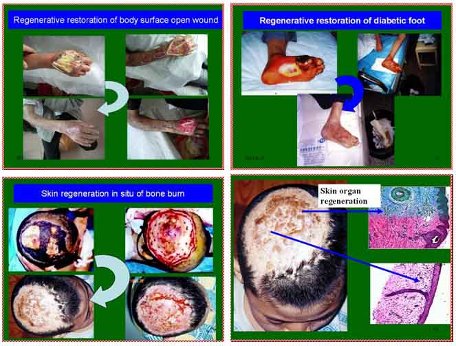 我们用以上图示的八项医疗技术实现了烧伤、电击伤全厚皮的愈合治疗,实现了大面积烧伤的成功救治,全国各级医院都成功的应用到了临床,并扩大到了一系列的创疡治疗中,现在又在治疗原理上,从烧伤的原位再生复原扩展到了整个生命科学领域。在掌握了再生定律这个科学的思维方式后,再加上我们实实在在的临床实践,我们大家就能成为一代医学大师。这次学术会议解决的是科学思维、科学思想问题。深度烧伤创面能够原位再生复原,创伤、溃疡等创面也就能原位再生复原。皮肤是人体最大的器官,皮肤已原位再生复原了,那么人体的各个器官就一定能够原位再生复原。