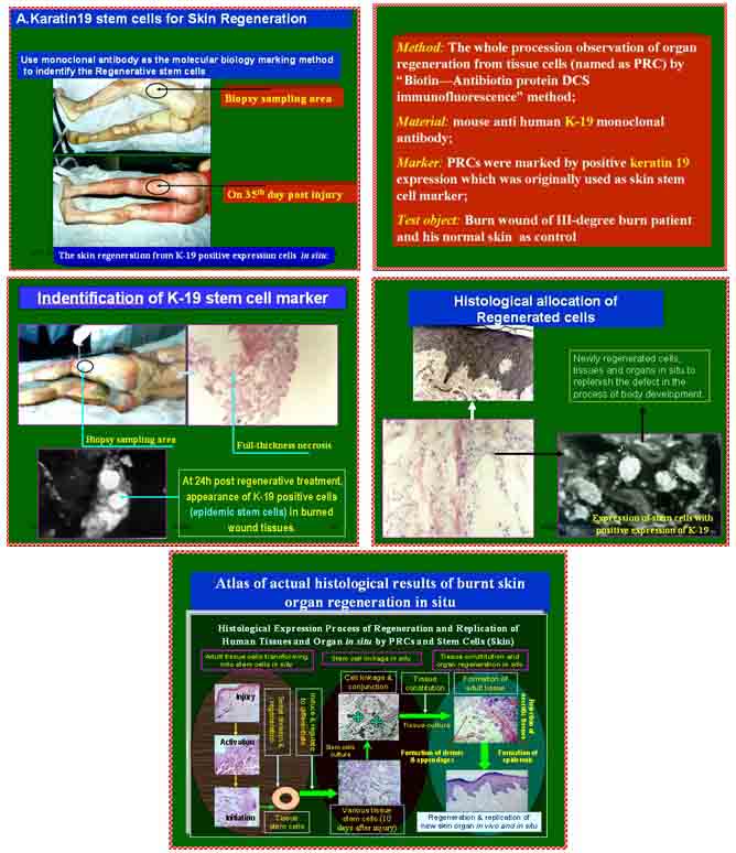 美国从脂肪组织中获取干细胞的技术利用的就是我们的思路。凡是利用这种思路研究的结果,就都属于我们中国人的发明,因为我们拥有这项技术的专利权,他们的研究是在看了我们的研究思路后才完成的。这就又形成一个定律:既然皮肤组织中能找出干细胞,那其他组织器官中也都能找出干细胞。而从器官组织中找到的干细胞的前身细胞是谁?这是这项科学体系的关键。在烧伤创面的研究中,我们确认干细胞来源于原位的组织细胞,我们早已将其命名为“潜能再生细胞”,这是人体各器官、组织先天存在的再生潜能,所以形成了皮肤具有再生潜能,人体各器官、组织都具有再生潜能的再生定律。