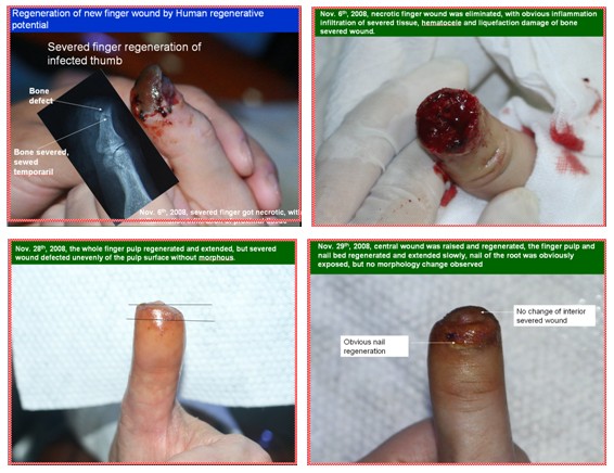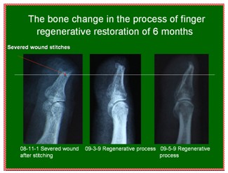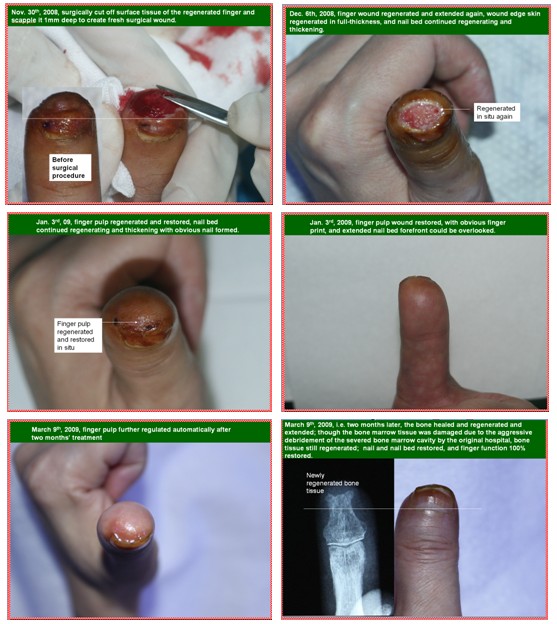 这是一个因外伤而断指的患者6d~7d的创面。该指体离断以后在医院进行了再植连接手术,但没有成活。而后来我们这里实施了原位再生复原断指治疗技术,因为是感染的创面,在22天时,创面就提前封闭了,但指体没有完全再生复原,缺少了一段。怎么办?由于我们按照生命定律确认所有器官里都有再生生命,重新再生的手指指体里仍然继承了人体再生潜能的结构,我们相信这个断指还能再生,所以我们重新截掉部分新再生的指体,形成新鲜的创面,再重新原位培养指体断面,最后指体原位再生复原了。人体是由上皮组织、结缔组织、肌肉组织、神经组织这四大组织组成,现在含有这四大组织的断指再生修复了,坚信人体组织完全可实现原位再生复原。以上病例验证了人体又表达出了新的再生生命定律。